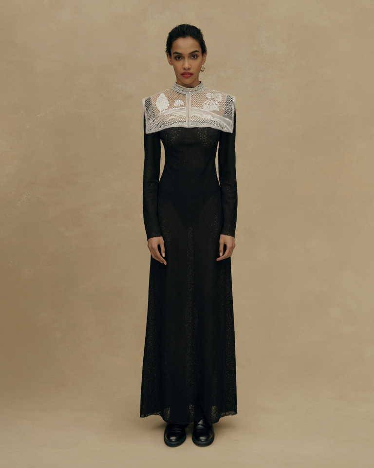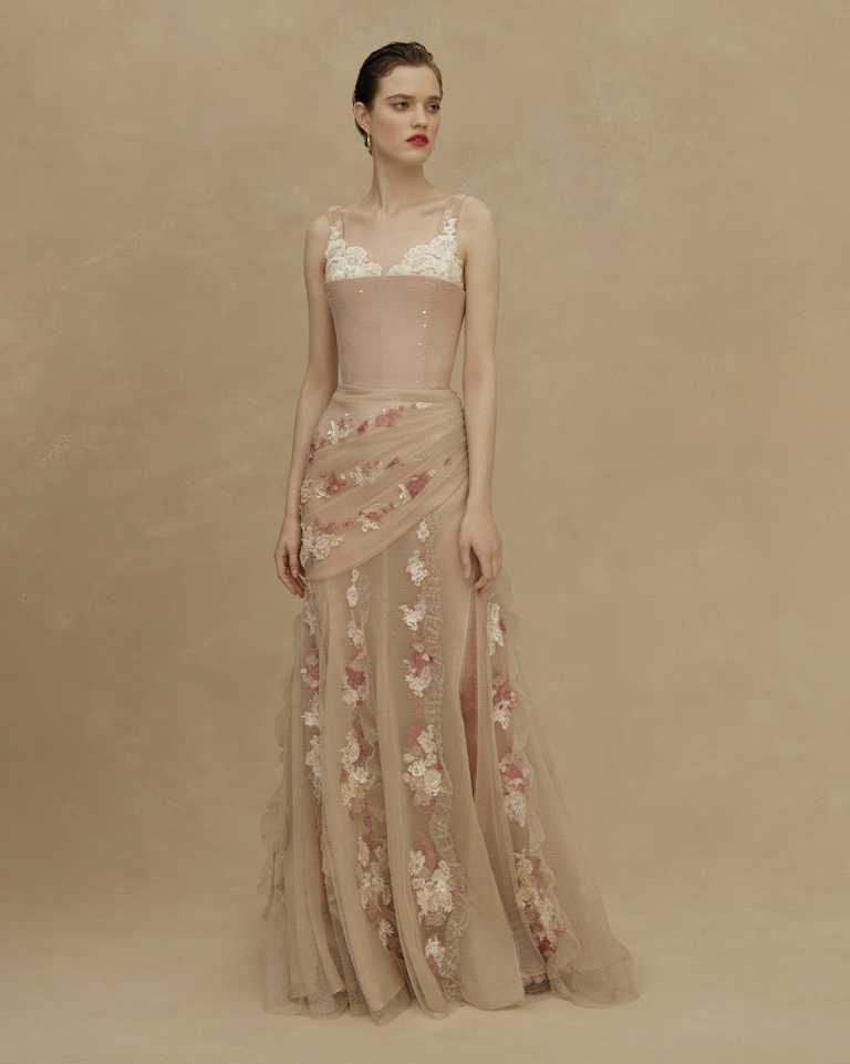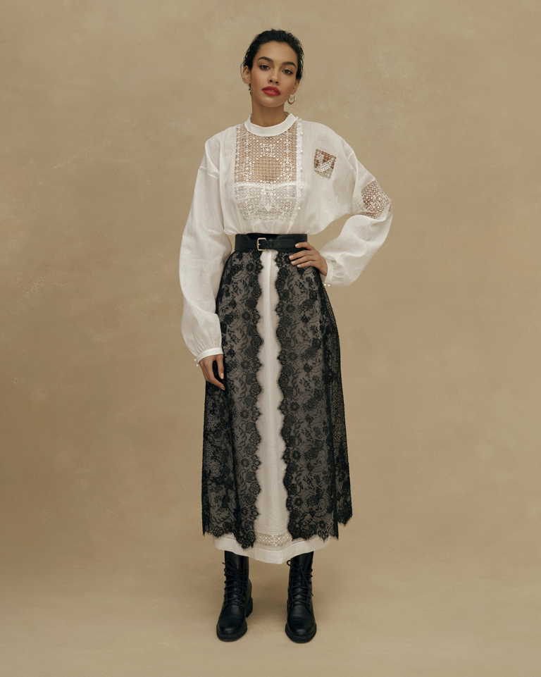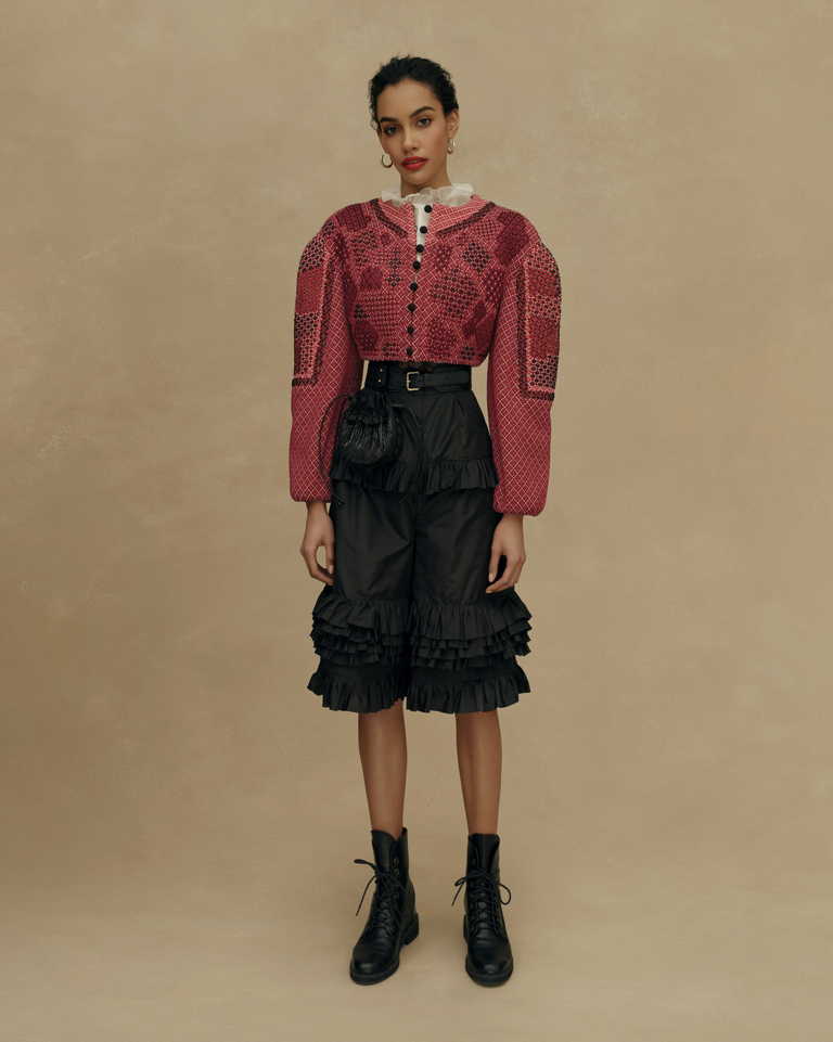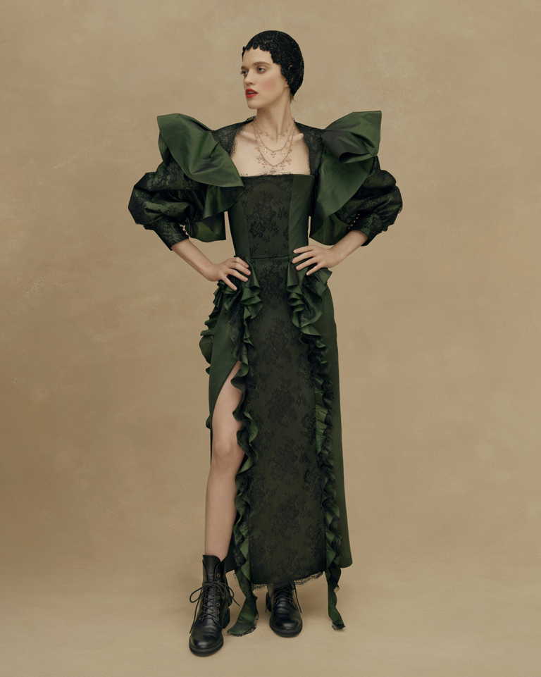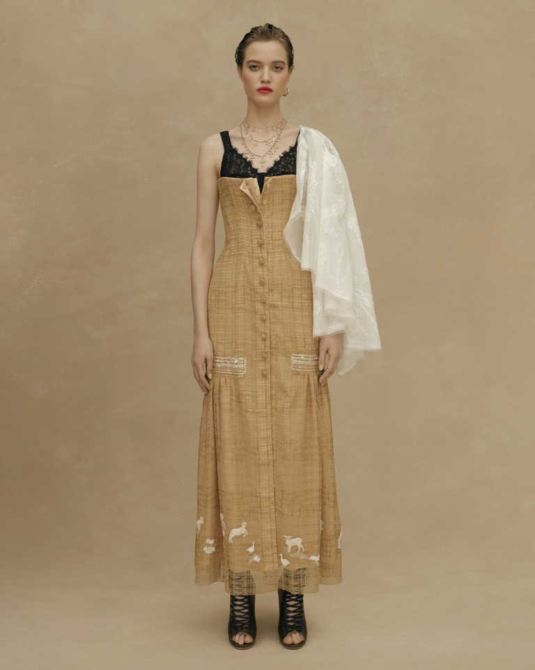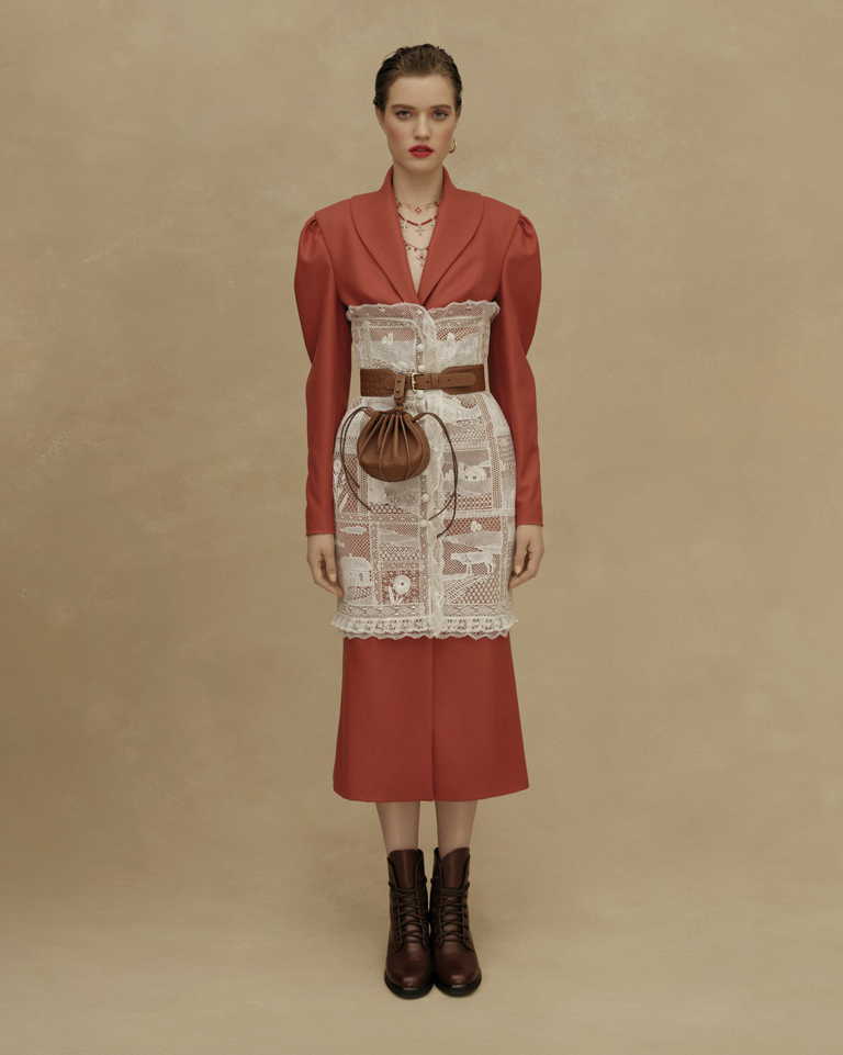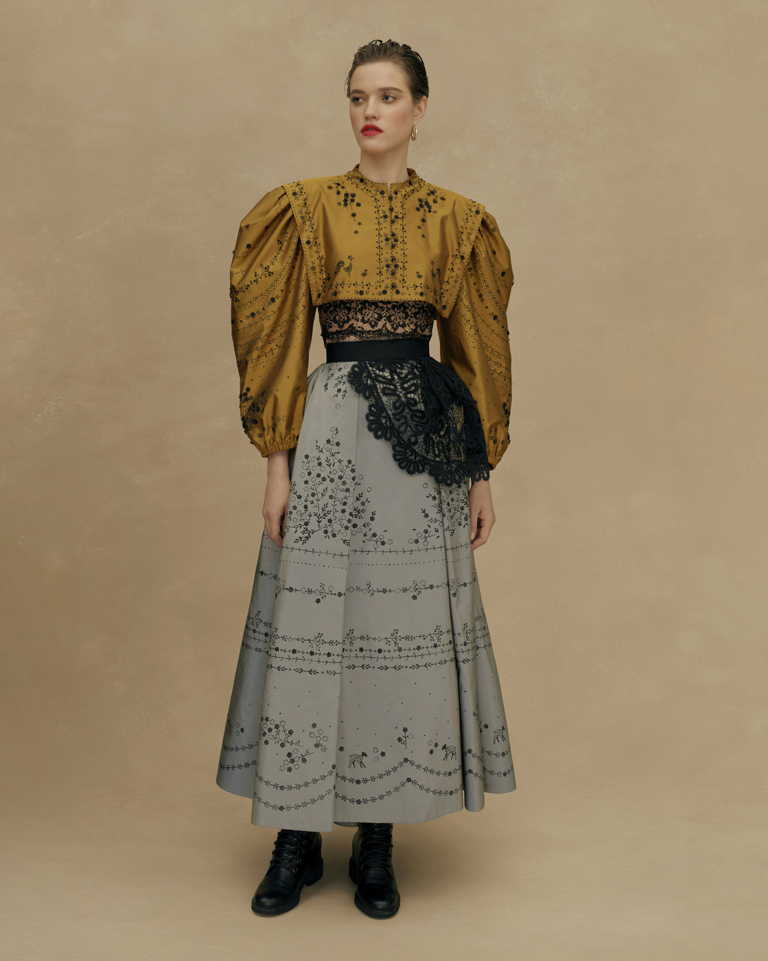 Основные элементы коллекции: платья и сарафаны со сборкой в виде поясных платков, широкие, словно с мужского плеча рубахи с ручной вышивкой, кружевные фартуки, многослойные юбки из тафты с набивным ручным рисунком, казачьи грубые сапоги и ботинки.