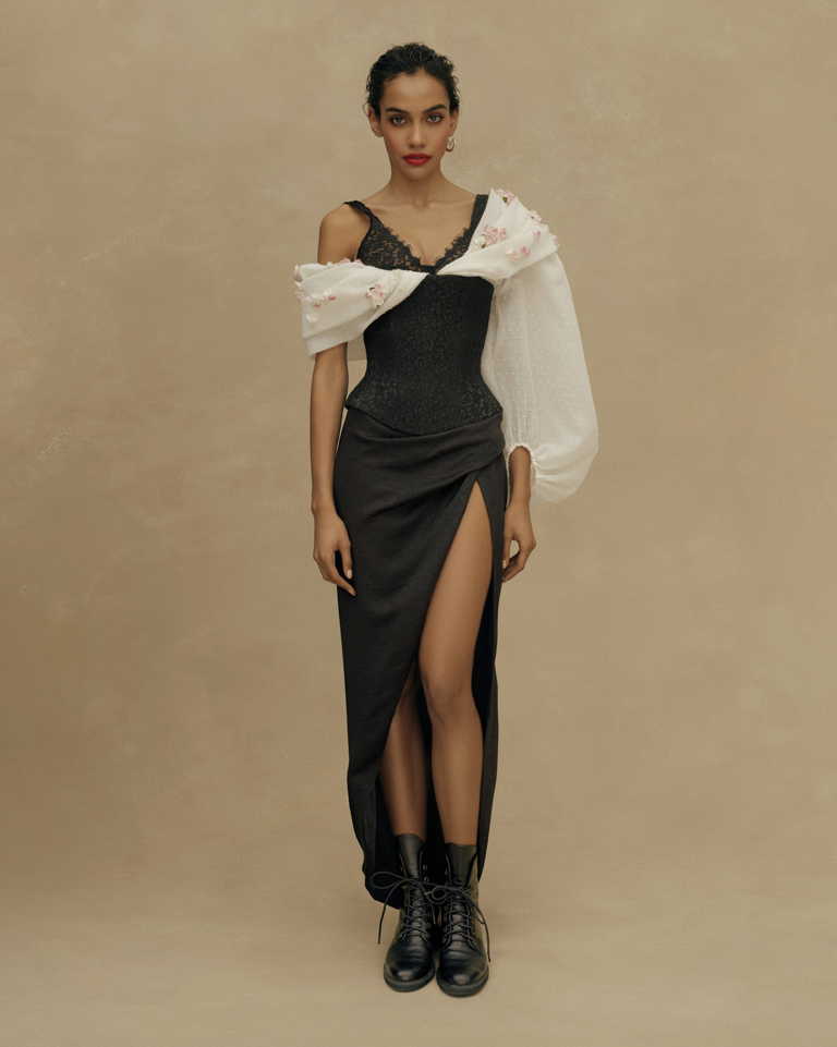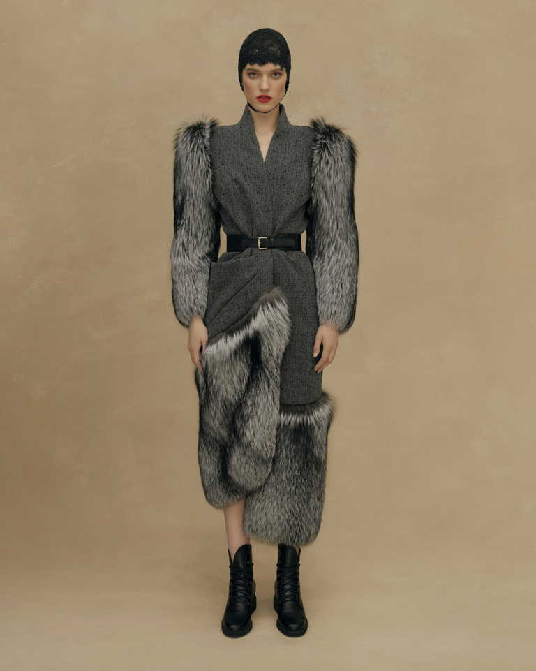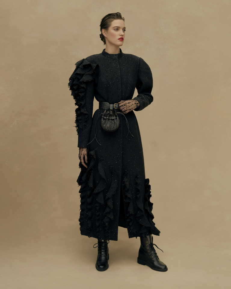 Стайлинговые приемы: многослойность, смешение стилей разных эпох, объемные плечи в духе 80-х, асимметрия, разнообразие фактур, подчеркнутая строгость образов.