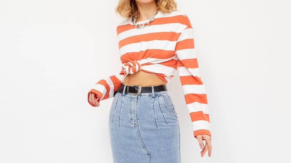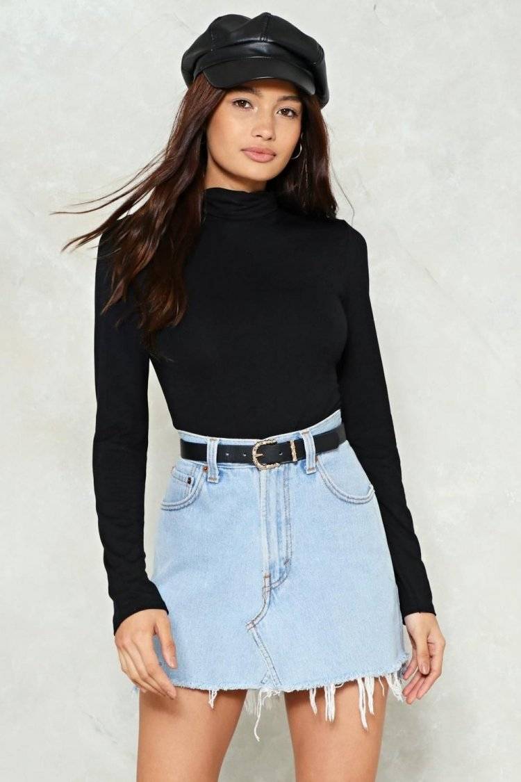 Когда на улице не так жарко, джинсовую юбку можно сочетать с лонгсливом. Образ получится более расслабленным, если вы повяжите лонгслив узлом. Дополнить аутфит можно бижутерией, а юбку подпоясать ремнем.