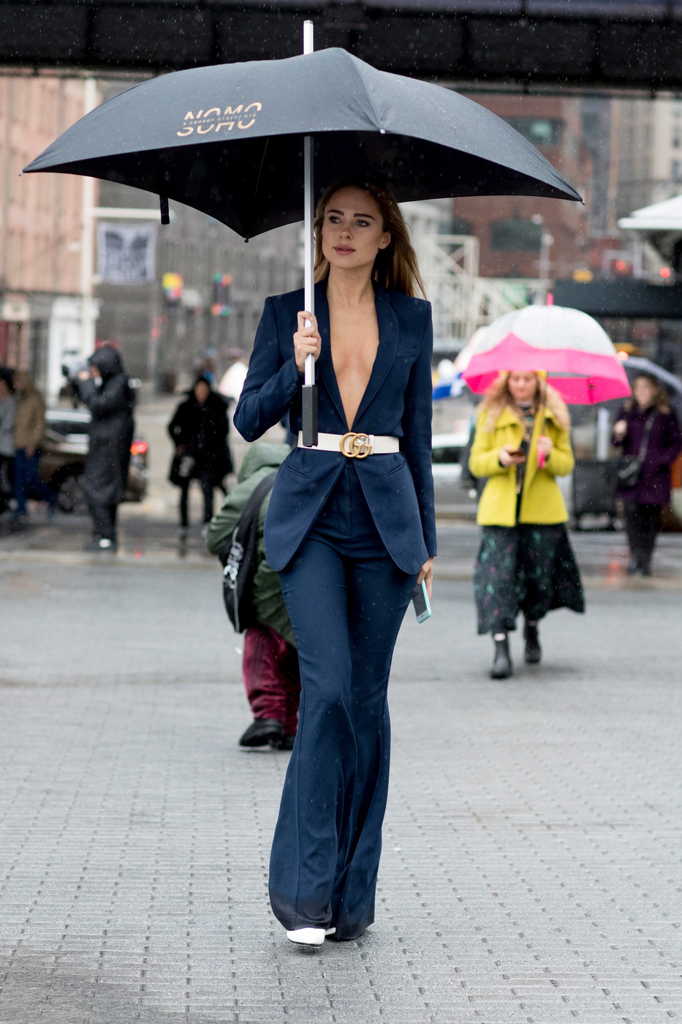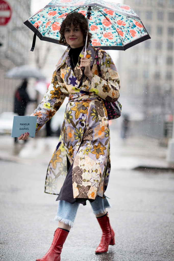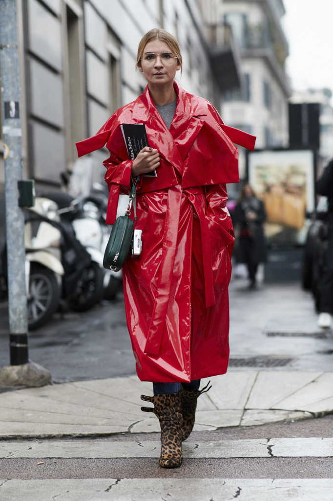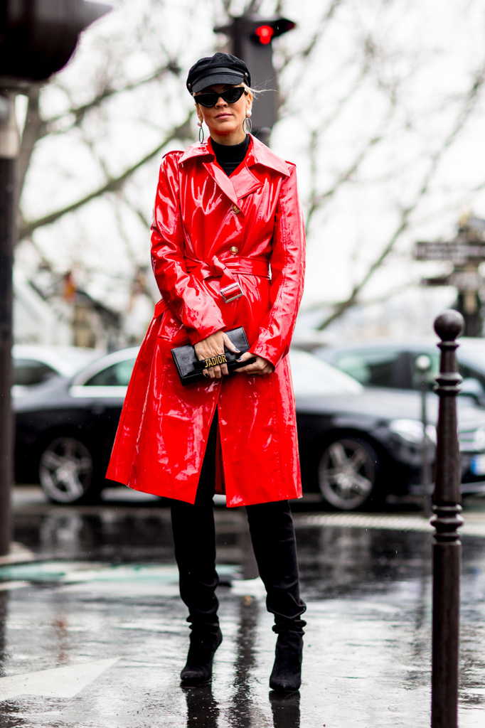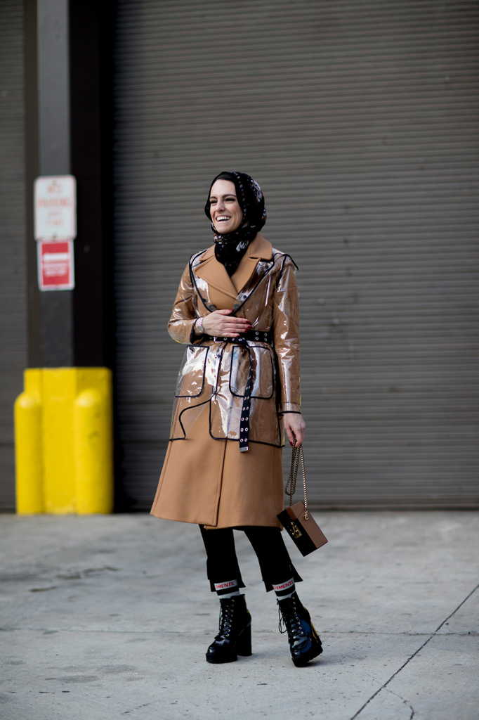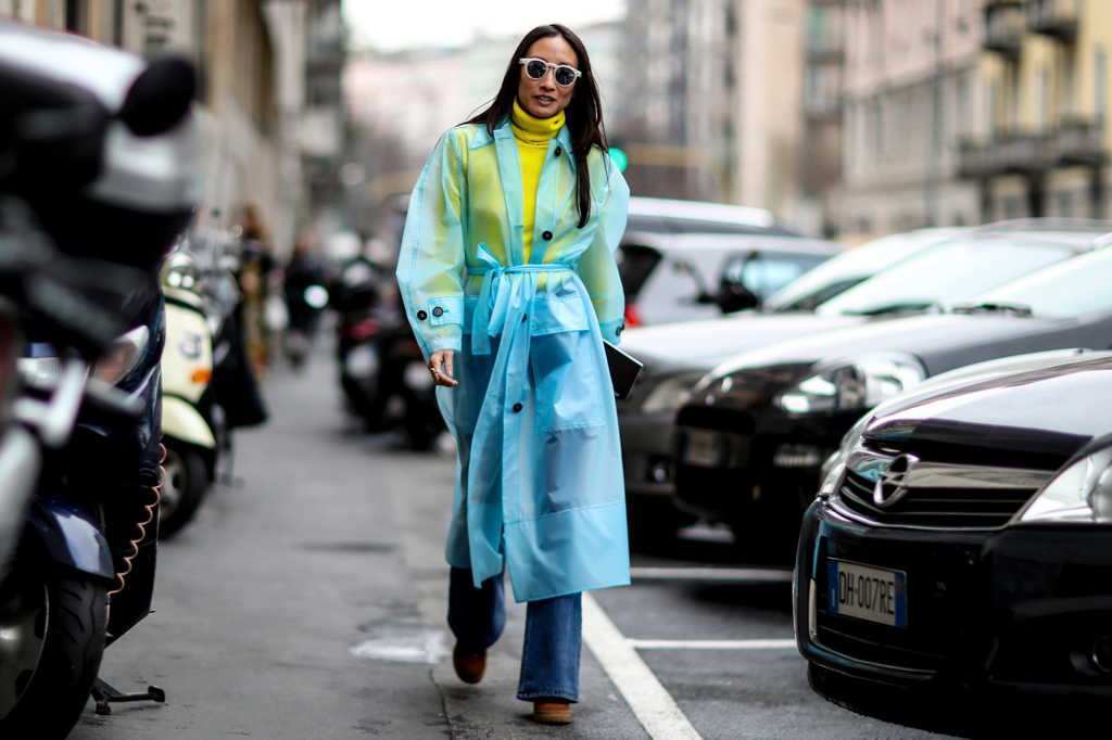 Еще один подхваченный из прошлого сезона тренд – ведущие модницы продолжают носить плащи из прозрачного пластика поверх традиционной верхней одежды.